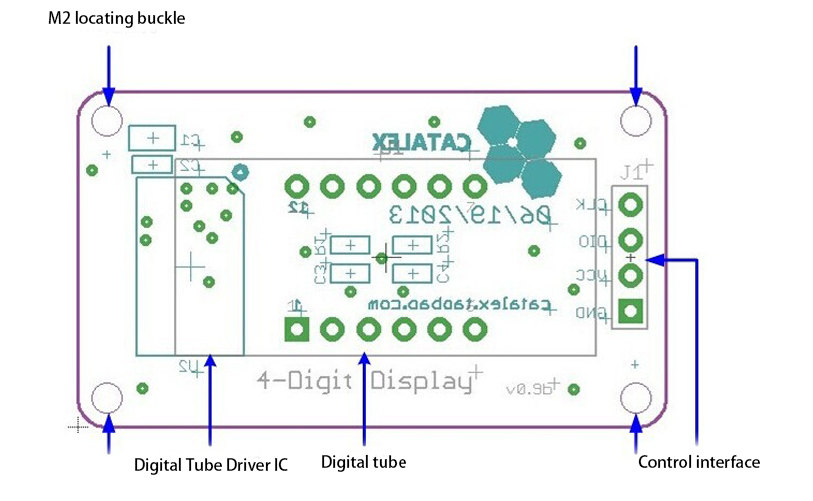 Control Interface: 4 pins total (GND, VCC, DIO, CLK). GND is ground, VCC is power supply, DIO is data input/output pin, CLK is clock signal pin;